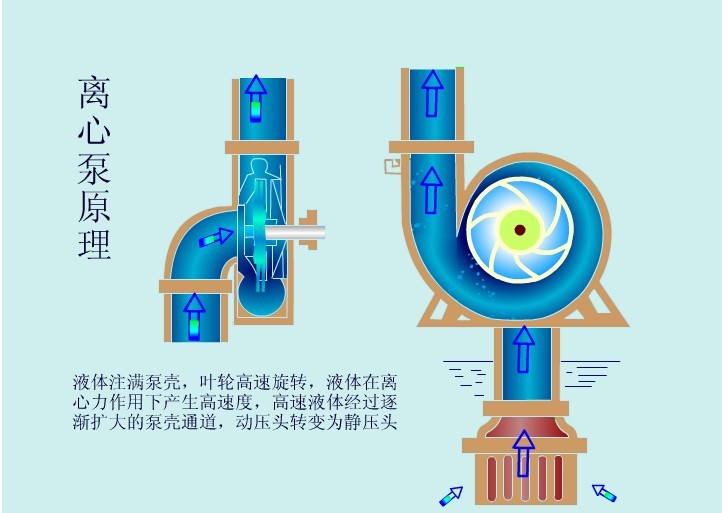 離心泵依靠旋轉(zhuǎn)葉輪對(duì)液體的作用把原動(dòng)機(jī)的機(jī)械能傳遞給液體。由于離心泵的作用液體從葉輪進(jìn)口流向出口的過程中,其速度能和壓力能都得到增加,被葉輪排出的液體經(jīng)過壓出室,大部分速度能轉(zhuǎn)換成壓力能,然后沿排出管路輸送出去,這時(shí),葉輪進(jìn)口處因液體的排出而形成真空或低壓,吸水池中的液體在液面壓力(大氣壓)的作用下,被壓入葉輪的進(jìn)口,于是,旋轉(zhuǎn)著的葉輪就連續(xù)不斷地吸入和排出液體。