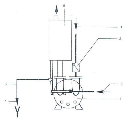 1. 2BV 真空泵 2. 供水管 3. 逆止閥 4. 吸氣管 5. 氣水分離器 6. 排氣管 7. 溢水管